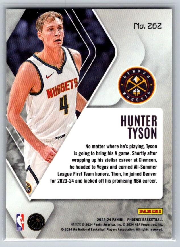 You are purchasing a 2023-24 Panini Phoenix Hunter Tyson #262 Phoenix Red Ice RC. You will receive the exact item in the photographs. Thank you for looking.