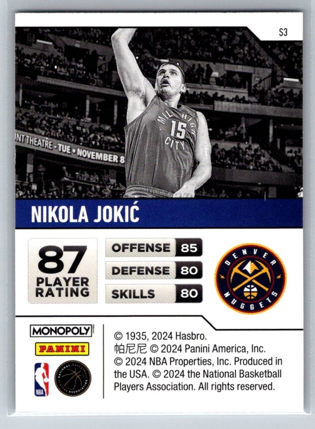 You are purchasing a 2023-24 Panini Prizm Monopoly Nikola Jokic #S3 Starter Deck. You will receive the exact item in the photographs. Thank you for looking.