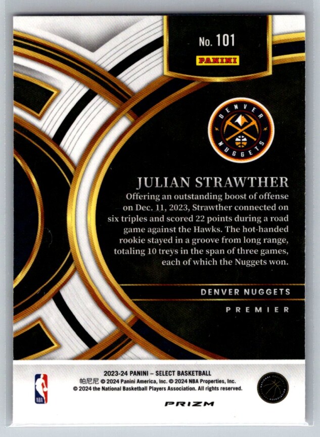 You are purchasing a 2023-24 Panini Select Julian Strawther #101 Orange Flash Prizm RC. You will receive the exact item in the photographs. Thank you for looking.