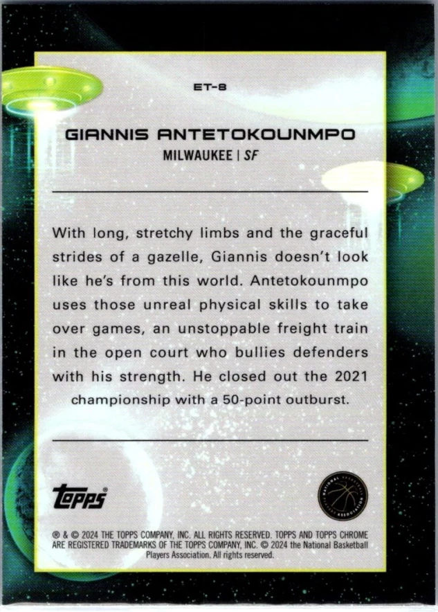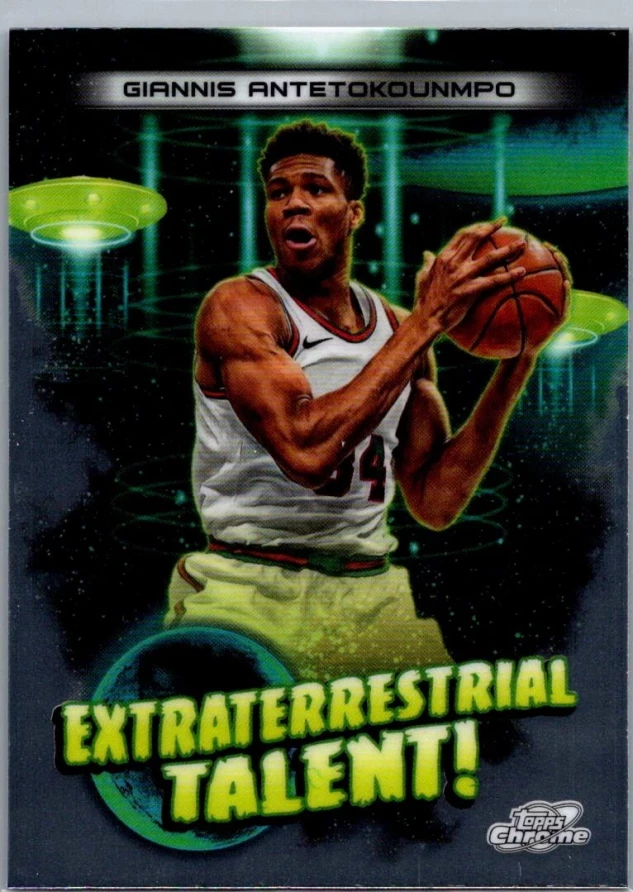 This is a nice example of a 2023-24 Topps Chrome Cosmic #ET-8 Giannis Antetokounmpo Extraterrestrial Talent