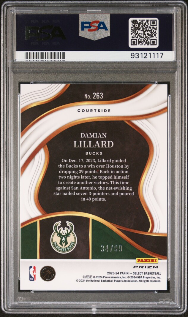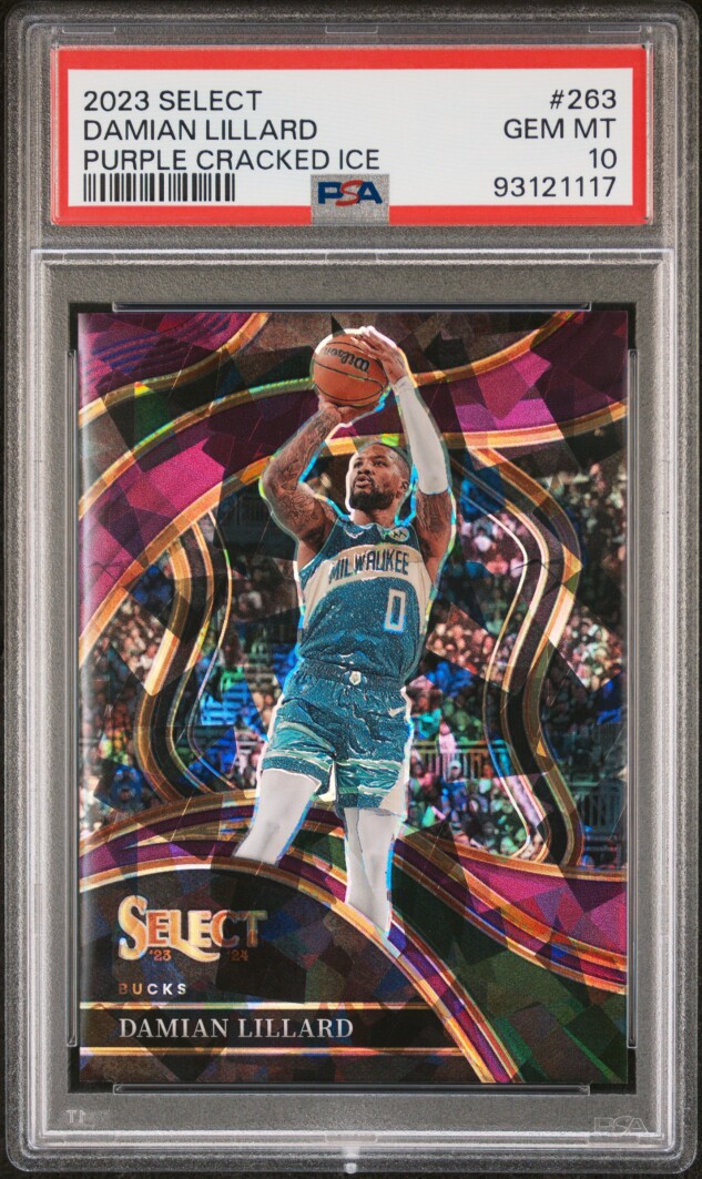 The 2023 Select Courtside Purple Cracked Ice Damian Lillard trading card is a highly sought-after collectible for basketball fans. With a limited print run of only 99, this card features the star player from the Milwaukee Bucks and is graded a perfect 10 by Professional Sports Authenticator (PSA). Made of card stock and manufactured by Panini, this original card is part of the NBA Finals event and comes in English language. The unique Purple Cracked Ice parallel adds a special touch to this rare and valuable sports trading card.