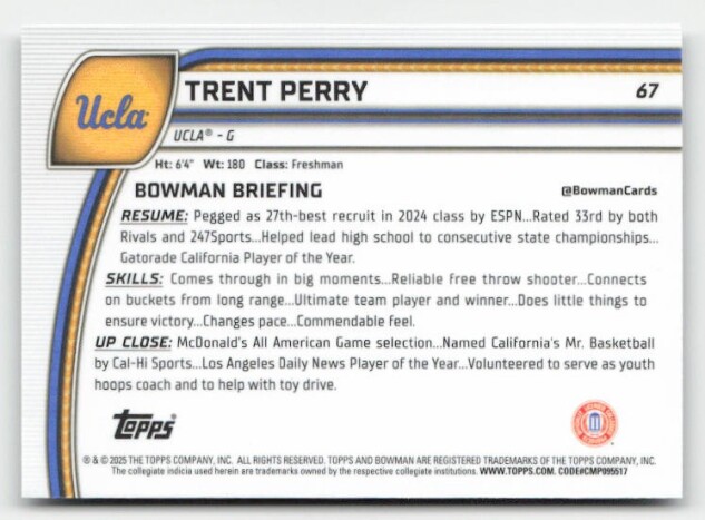 You are purchasing a 2024-25 Bowman University Chrome Trent Perry #67. You will receive the exact item in the photographs. Thank you for looking.