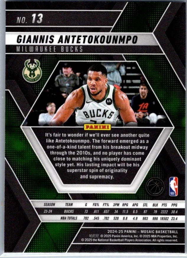 This is a nice example of a 2024-25 Panini Mosaic #13 Giannis Antetokounmpo