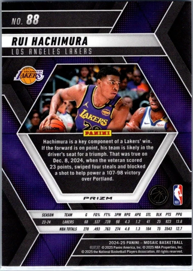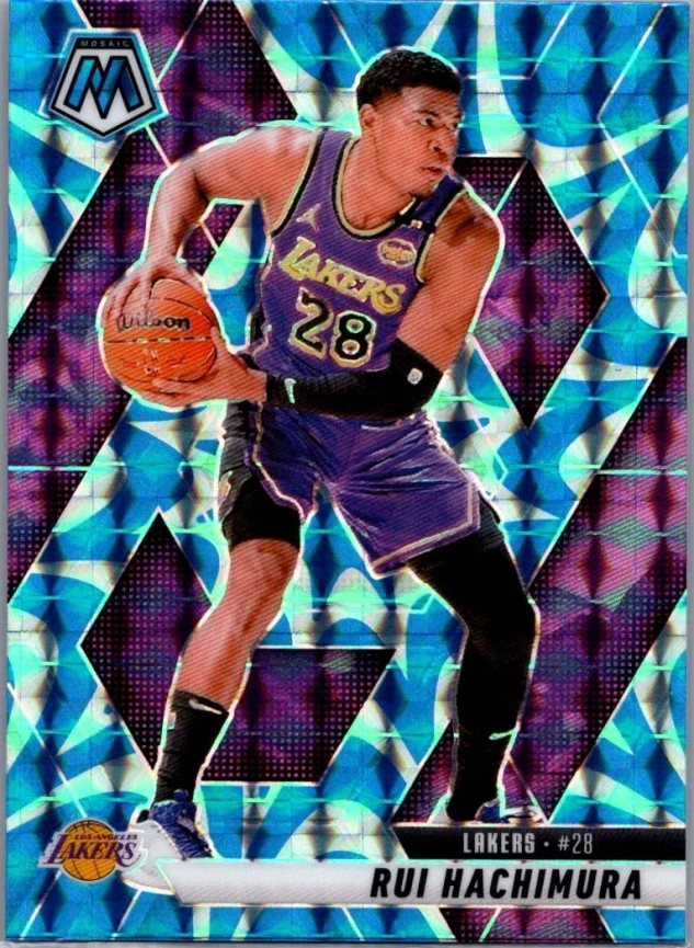 This is a nice example of a 2024-25 Panini Mosaic #88 Rui Hachimura Reactive Blue Mosaic