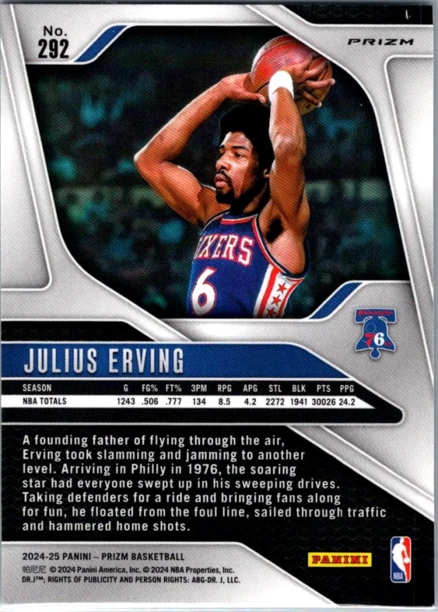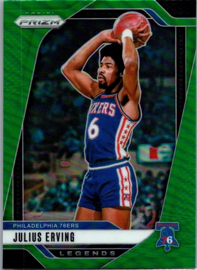 This is a nice example of a 2024-25 Panini Prizm #292 Julius Erving Prizms Green