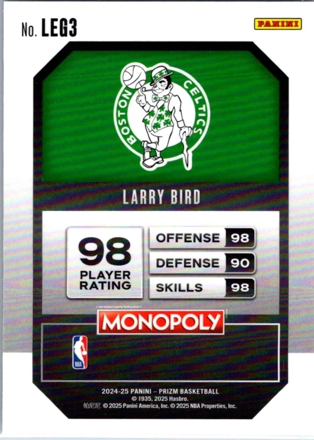 This is a nice example of a 2024-25 Panini Prizm Monopoly #LEG3 Larry Bird Legends