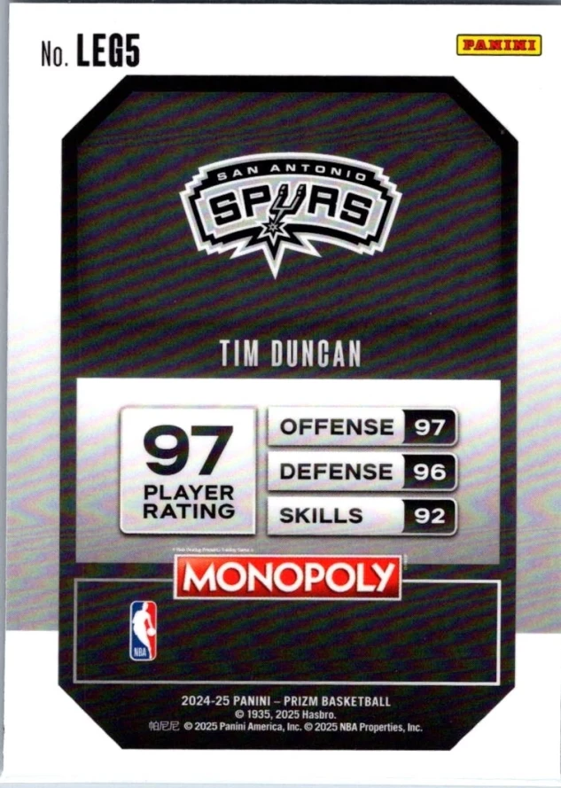 This is a nice example of a 2024-25 Panini Prizm Monopoly #LEG5 Tim Duncan Legends