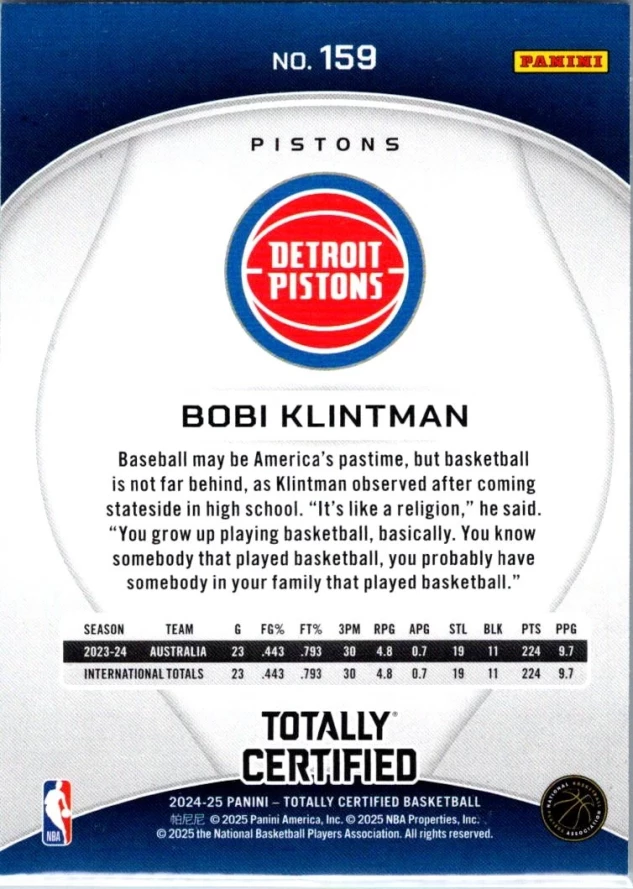 This is a nice example of a 2024-25 Panini Totally Certified #159 Bobi Klintman