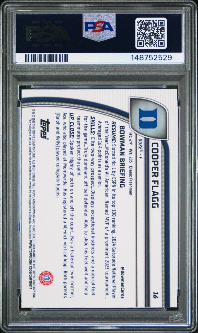 You are purchasing a 2024 Bowman Chrome University Cooper Flagg #16 Purple Lava PSA 9. Thank you for looking.