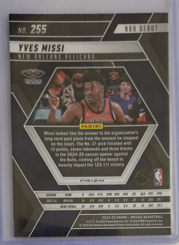 2024 Mosaic NBA Debut Yves Missi #255. *Card will ship in protective sleeves and a cardboard box, I do not ship using PWE or BM.