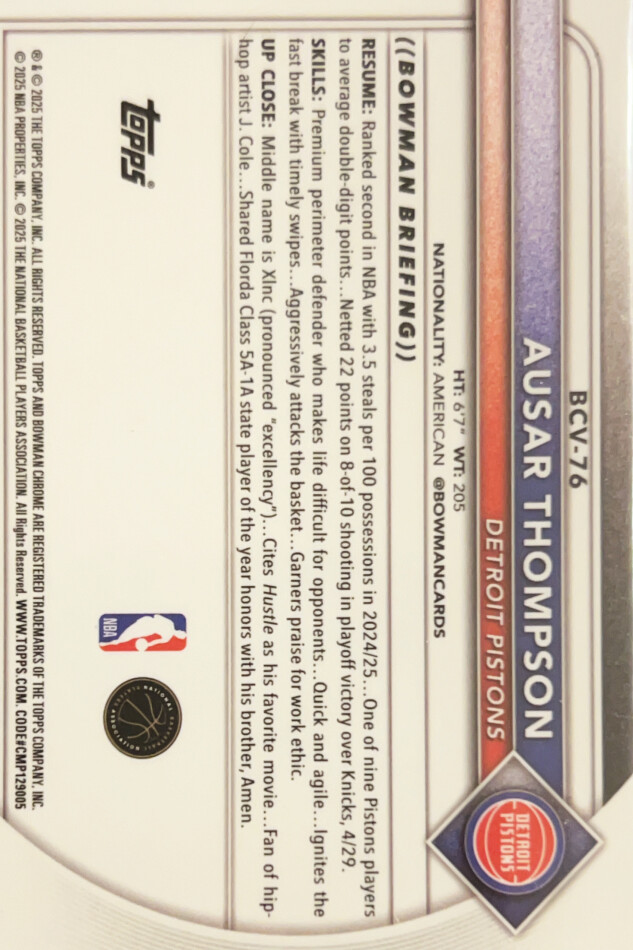 You are purchasing a 2024 Topps Bowman Chrome Ausar Thompson #BCV-76. You will receive the exact item in the photographs. Thank you for looking.