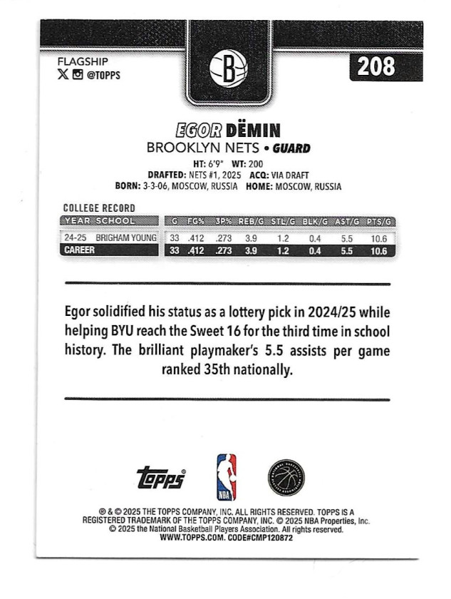 2025-26 Topps #208 Egor Demin (RC) - Brooklyn Nets (M298)