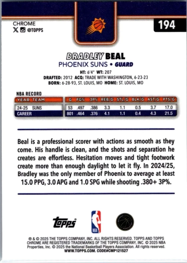 This is a nice example of a 2025-26 Topps Chrome #194 Bradley Beal