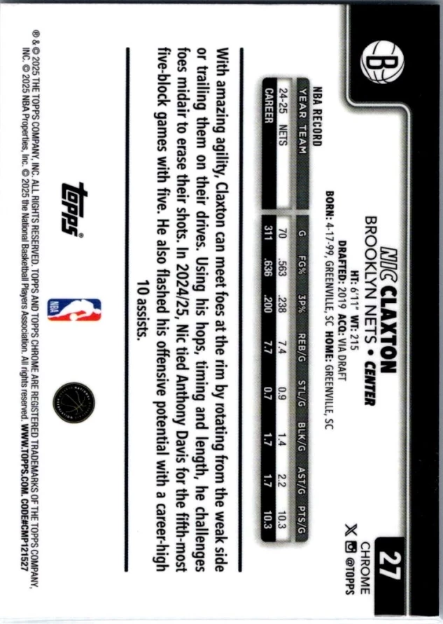 This is a nice example of a 2025-26 Topps Chrome #27 Nic Claxton