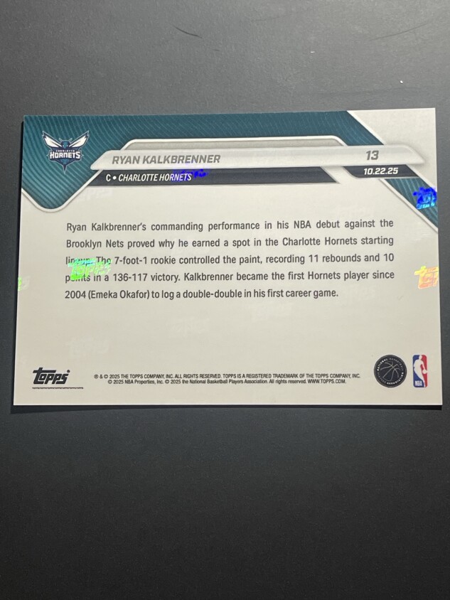 2025-26 Topps Now NBA #13 Ryan Kalkbrenner Base Card RC Rookie PR:508 Ships ASAP