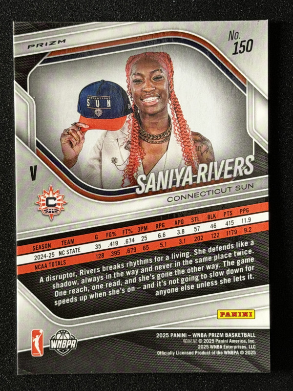 You are purchasing a 2025 Panini Prizm WNBA Photo Variation Saniya Rivers #150 Cracked Ice Rookie RC .