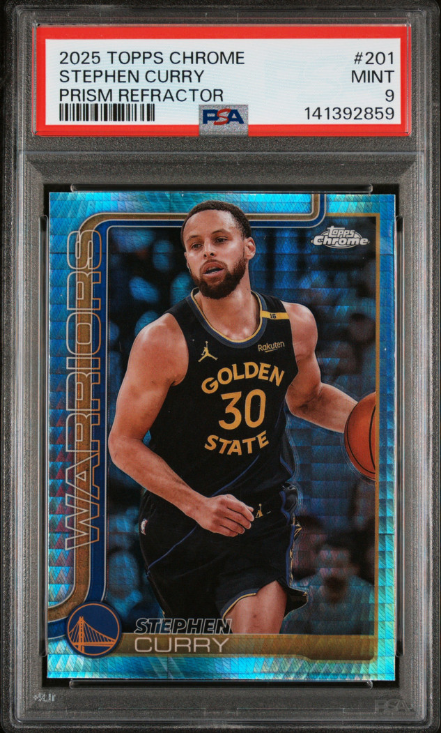 The product is a 2025 Topps Chrome Prism Refractor trading card featuring basketball player Stephen Curry. This card, numbered 201, has been professionally graded as a PSA 9 MINT, ensuring its high quality and authenticity. With its sleek design and rarity as a refractor parallel, this card is sure to be a prized possession for any basketball card collector.