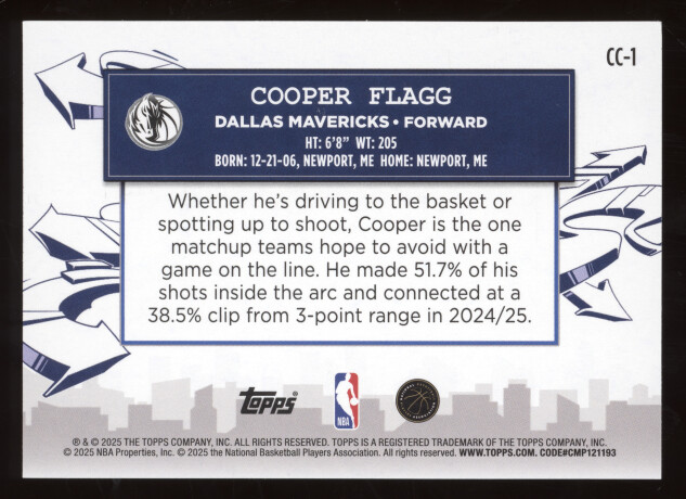 You are purchasing a 2025 Topps Clutch City Prospects Cooper Flagg #CC-1 Holo Foil RC. You will receive the exact item in the photographs. Thank you for looking.