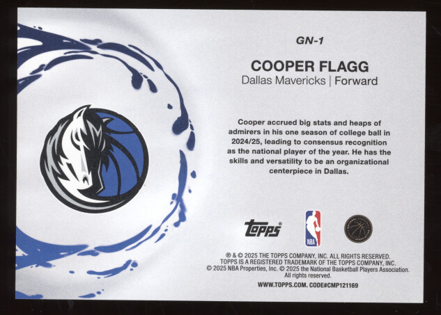 You are purchasing a 2025 Topps Generation Now Cooper Flagg #GN-1 Holo Foil RC. You will receive the exact item in the photographs. Thank you for looking.