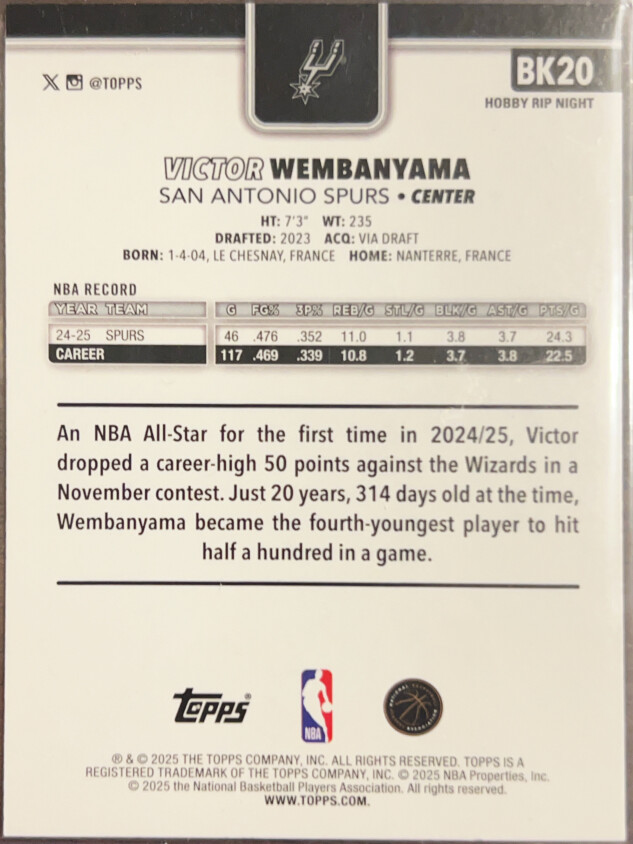 You are purchasing a 2025 Topps Hobby Rip Night Victor Wembanyama #BK20. You will receive the exact item in the photographs. Thank you for looking.