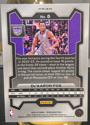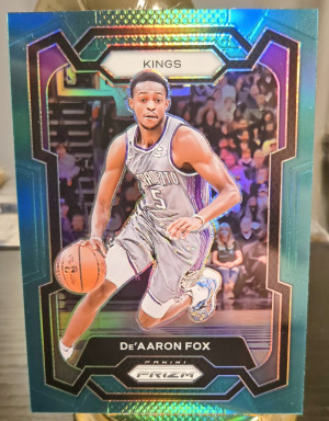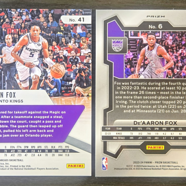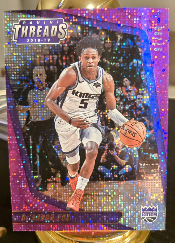The product is a set of two basketball trading cards featuring De'Aaron Fox, a player for the Sacramento Kings in the National Basketball Association (NBA). The cards are from the 2018-19 Panini Threads Purple Dazzle series, with one card numbered out of 99, and the 2023-24 Green Prizm series. Both cards are serial numbered and considered parallel, adding to their collectibility and uniqueness. As manufactured by Panini, these cards are highly sought after by fans and collectors for their rarity and association with a rising star in the NBA.