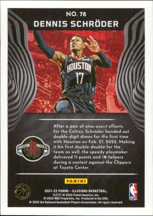 You are purchasing a 2021-22 Panini Illusions Dennis Schroder #78. You will receive the exact item in the photographs. Thank you for looking.