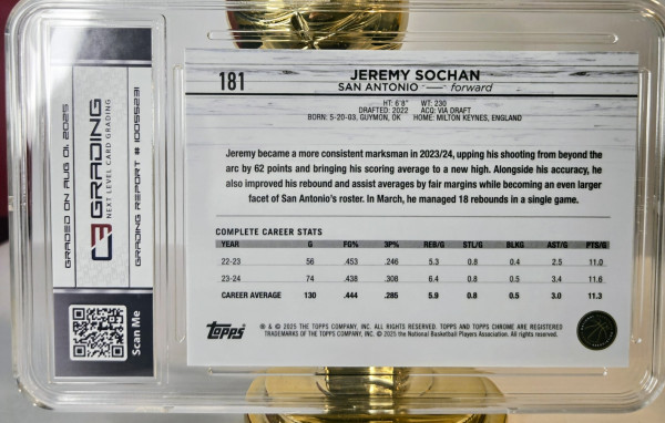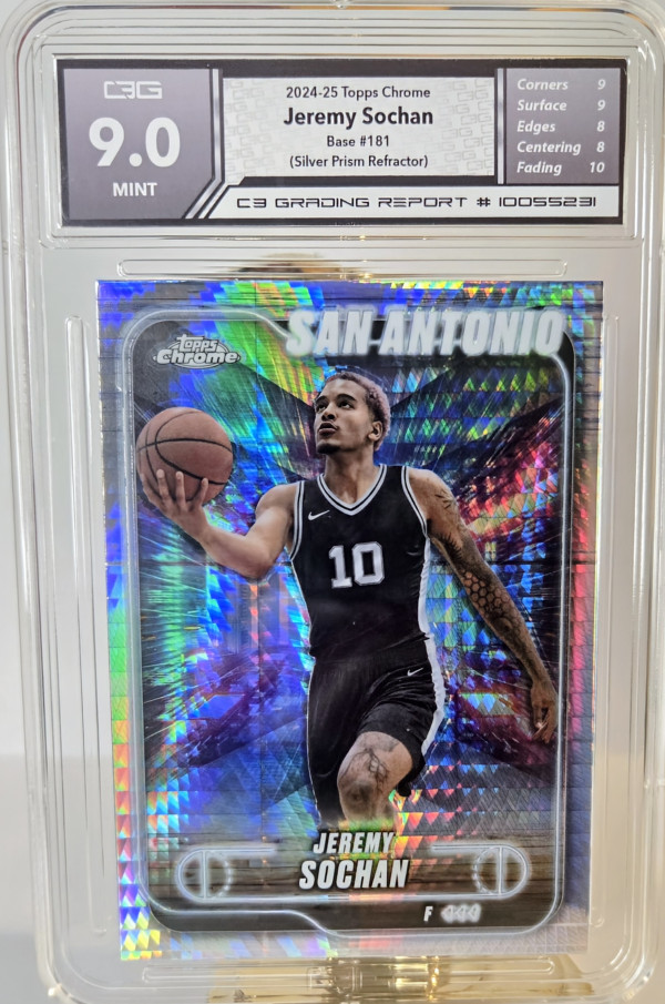 The product is a 2024-25 Topps Chrome Silver Prism Refractor trading card featuring Jeremy Sochan of the San Antonio Spurs. This card is part of the Topps Chrome set for the National Basketball Association (NBA) season. The Prism Refractor parallel adds a shiny, reflective quality to the card, making it a desirable collectible for basketball fans and card enthusiasts. With a card number of 181, this item showcases the unique features and design that Topps is known for in the sports trading card market.