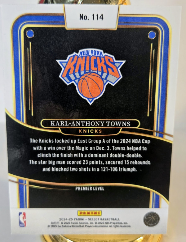 The product is a 2024-25 Panini Select Premier Level trading card featuring NBA player Karl-Anthony Towns from the New York Knicks. This basketball card is part of the base set and showcases a parallel/variety design, making it a valuable collectible for fans and collectors. With a card number of 114, this Panini Select card is a sought-after item for those interested in sports trading cards and memorabilia.