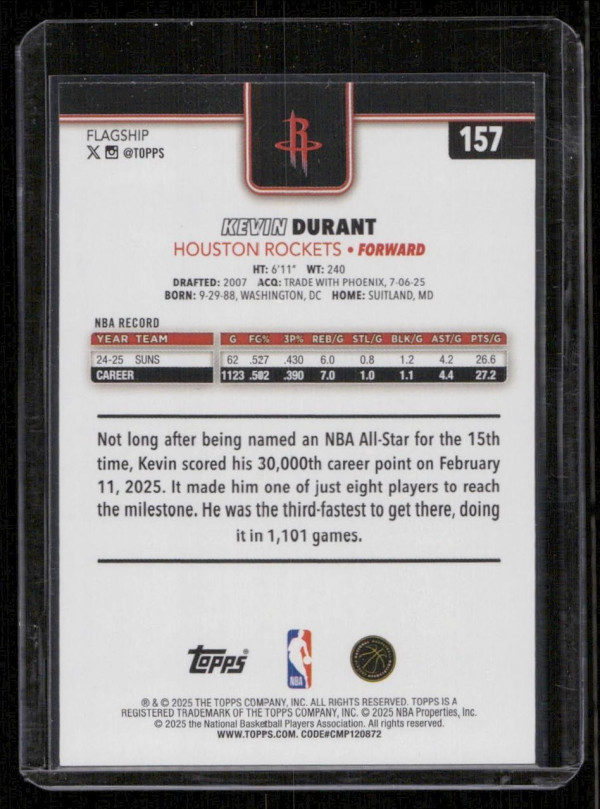 You are purchasing a 2025-26 Topps Kevin Durant #157. You will receive the exact item in the photographs. Thank you for looking.