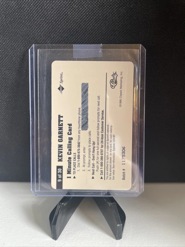 This Kevin Garnett trading card is a great addition to any collection. The card features a $1 phone card design and is part of the 1996 Classic Phone Cards set. It is an original card made of card stock and is not a licensed reprint. The card number is 9 and it is for the Minnesota Timberwolves. The card is in excellent shape and would make a great gift for any NBA fan.