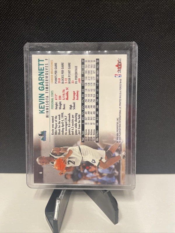 This Kevin Garnett 1999 Fleer Force trading card features the basketball player in his Minnesota Timberwolves uniform, with his name and team displayed prominently on the front. The card is made of high-quality card stock and is an original release from the manufacturer, Fleer. The card number is 6 and it is part of the base set for the 1999 season.