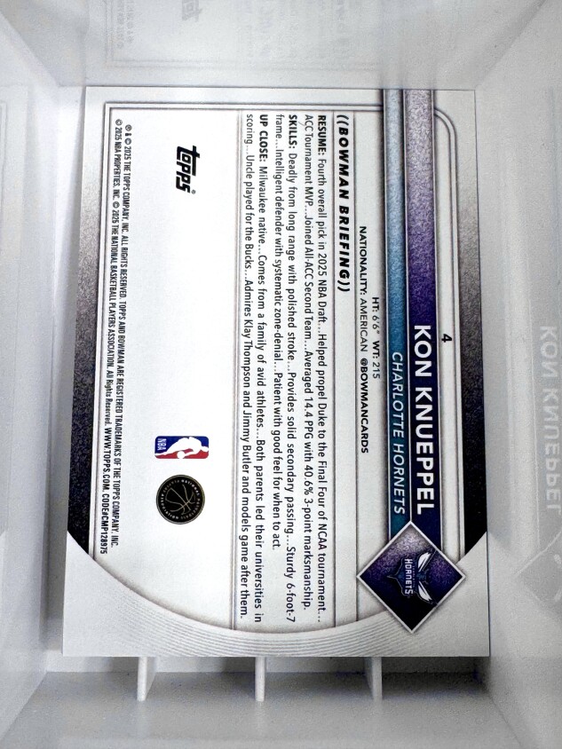 You are purchasing a 2026 Bowman Basketball Kon Knueppel #4 (RC) [CLEAN]. You will receive the exact item in the photographs. Thank you for looking.