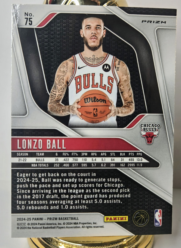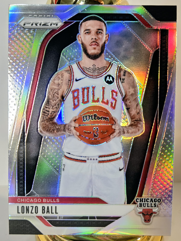 The product is a 2024-25 Panini Prizm Basketball Silver Prizm trading card featuring Lonzo Ball of the Chicago Bulls. This card is part of the base set for the specified season and league, showcasing a parallel/variety design. Manufactured by Panini, this ungraded card is in excellent condition and is a valuable addition to any basketball card collection, especially for fans of the NBA and the Chicago Bulls.