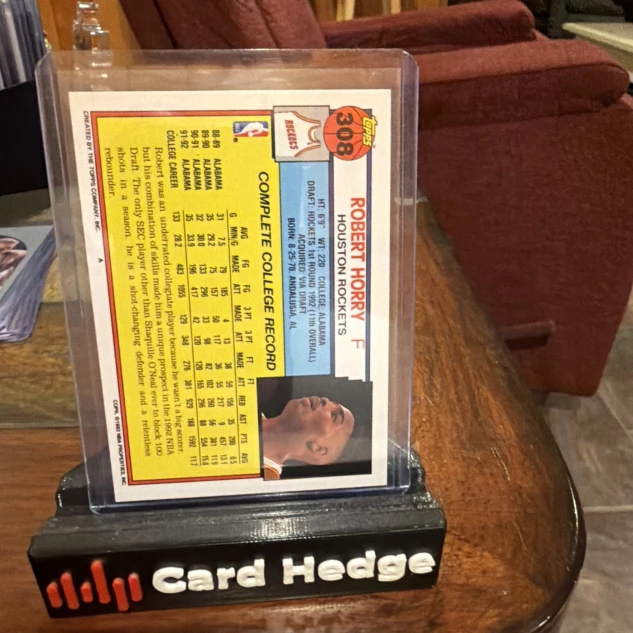 The product is a 1992 Topps Gold #308 RC trading card featuring NBA player Robert Horry during his rookie season with the Houston Rockets. This original sports trading card is made of card stock and is part of the 1992 Topps set. The card is in English, has a standard size, and is a gold parallel variety, making it a sought-after collectible for basketball fans and trading card enthusiasts alike.