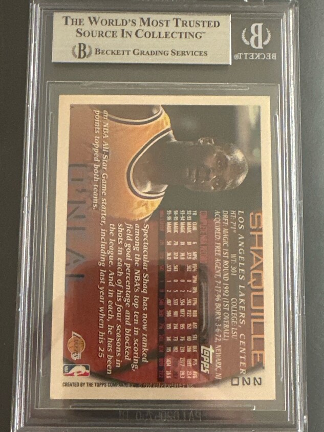Clean mid-90s Shaq in a classic Lakers uniform. This 1996–97 Topps #220 is graded BGS 8 (Near Mint–Mint) and presents really well with strong eye appeal. Great addition for any Shaq collector or vintage NBA set builder.
