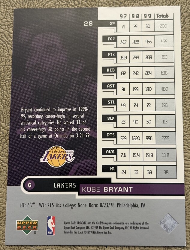 Upper Deck 1999-00 HoloGrFX Kobe Bryant #28 Lakers Hologram Basketball Card