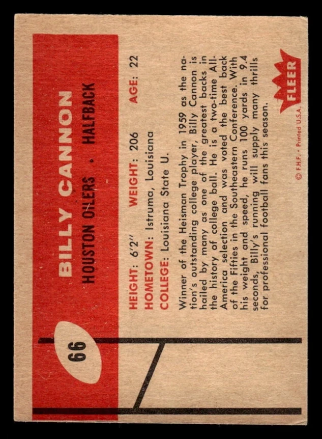 1960 Fleer #66 Billy Cannon UER RC Rookie VG/EX