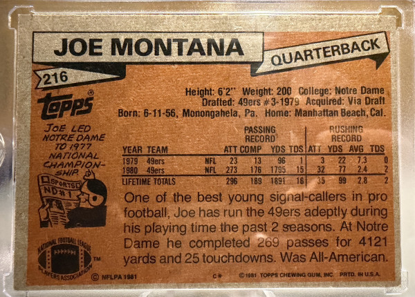 You are purchasing a 1981 Topps #216 Joe Montana Rookie. Upon purchase you will receive the exact card pictured. Thanks!