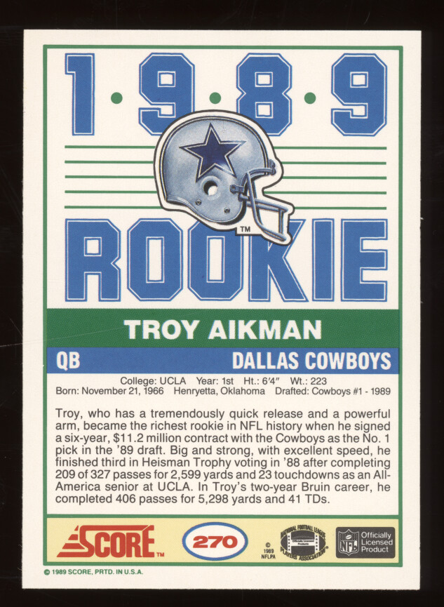 You are purchasing a 1989 Score Troy Aikman #270 RC. You will receive the exact item in the photographs. Thank you for looking.