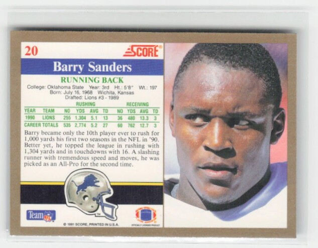 You are purchasing a 1991 Score Barry Sanders #20 CLEAN CARD Crispy Corners. You will receive the exact item in the photographs. Thank you for looking.