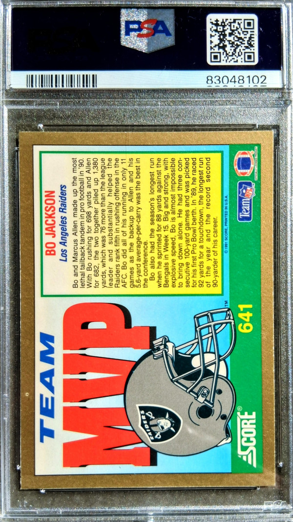 Vivid PSA 9 of a Bo Jackson Raiders card. Will ship in padded envelope (with added protection) via USPS with no tracking or insurance.