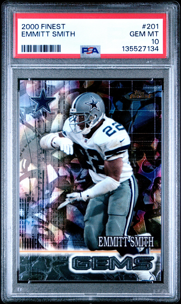 The product is a 2000 Finest Football trading card featuring Emmitt Smith, graded as a PSA 10 GEM MINT. This card, manufactured by Topps, is a highly sought after collectible item for fans of football and sports trading cards. The certification number for this specific card is 135527134, showcasing its authenticity and pristine condition. With a Grade 10 rating from a professional grader, this Emmitt Smith trading card is a valuable and prized possession for any collector.