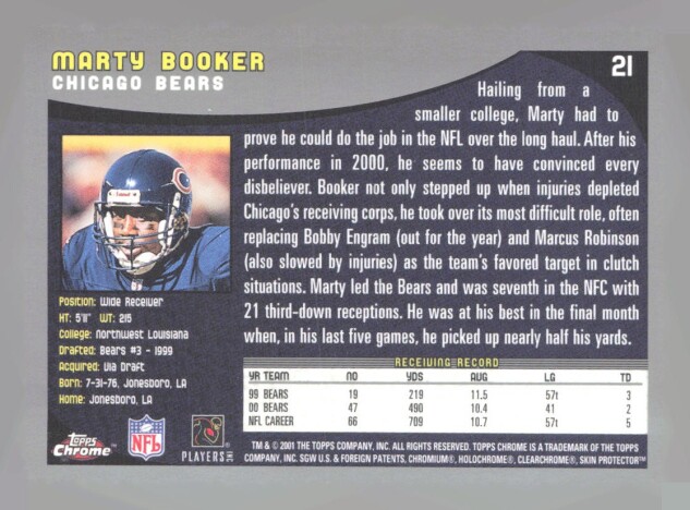 You are purchasing a 2001 Topps Chrome Marty Booker #21. You will receive the exact item in the photographs. Thank you for looking.