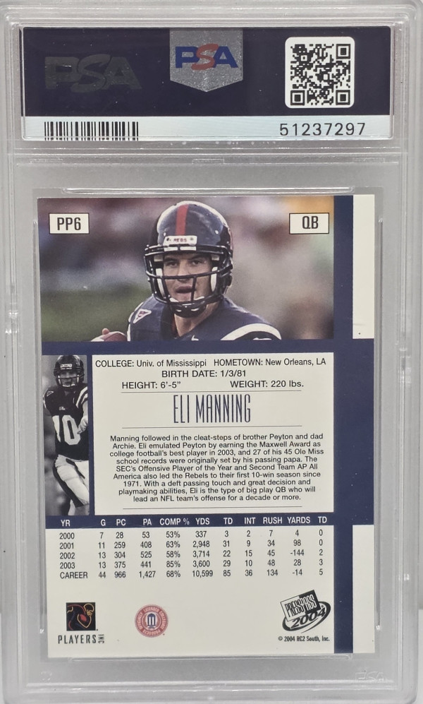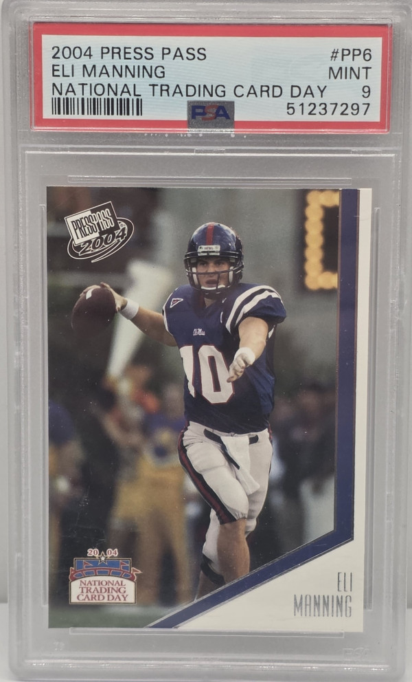 Own a piece of New York Giants history with this 2004 Press Pass National Trading Card Day Eli Manning #PP6, pristine in a PSA 9 Mint slab. This iconic rookie-era card captures the two-time Super Bowl MVP in his legendary Ole Miss colors just as he began his journey to NFL greatness. As a first-ballot Hall of Fame lock, Manning's
