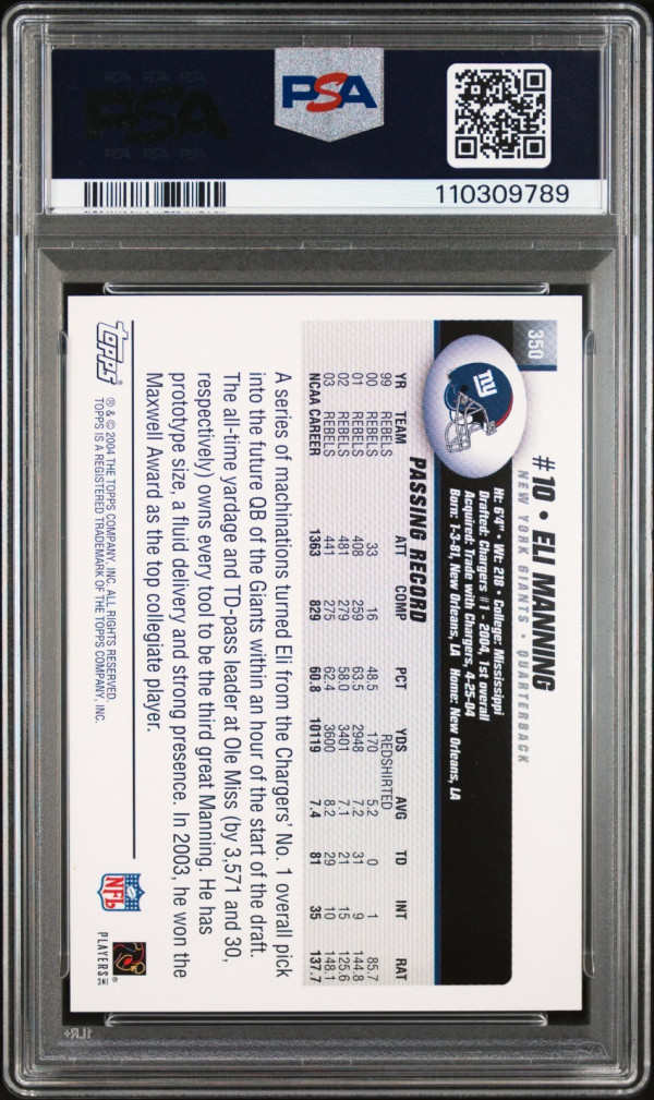 You are purchasing a 2004 Topps Eli Manning #350 Low Pop Rookie PSA 10. You will receive the exact item in the photographs.