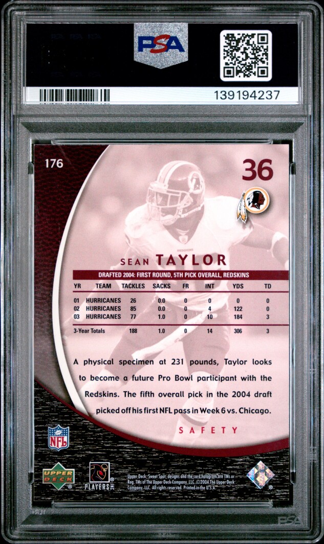 You are purchasing a 2004 Upper Deck Sweet Spot Sean Taylor PSA 9. You will receive the exact item in the photographs. Thank you for looking.