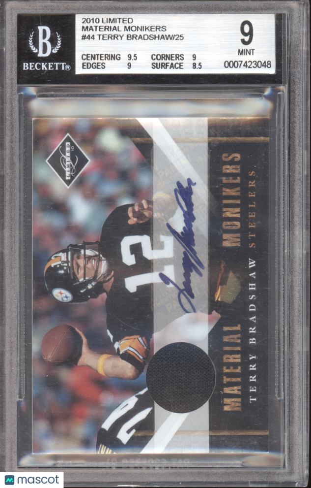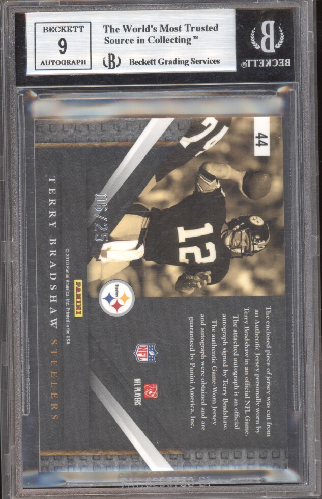 You are purchasing a 2010 Limited Material Monikers Terry Bradshaw #44 06/25 BGS 9 Auto 9. You will receive the exact item in the photographs. Thank you for looking.