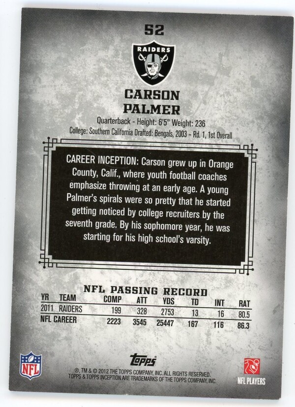 2012 Topps Inception #52 Carson Palmer Blue 208/252