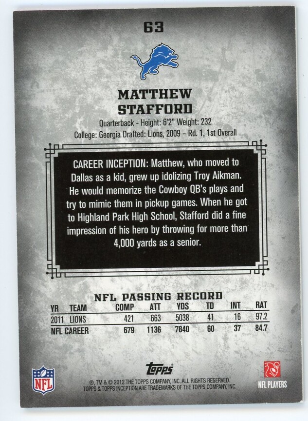 2012 Topps Inception #63 Matthew Stafford Blue /252 ***VF-NM***