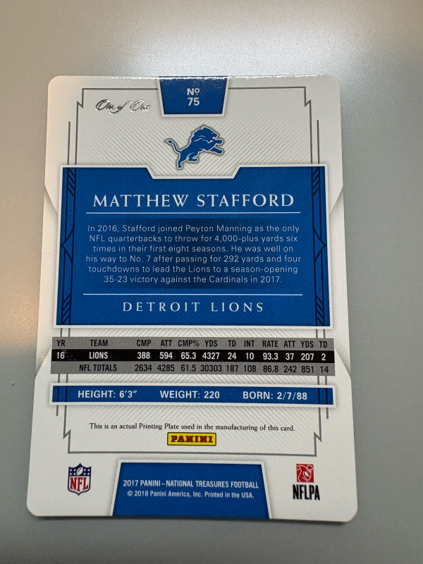 2018 Nat’l Treasures 1/1 Matthew Stafford Printing Plate 1 Of 1